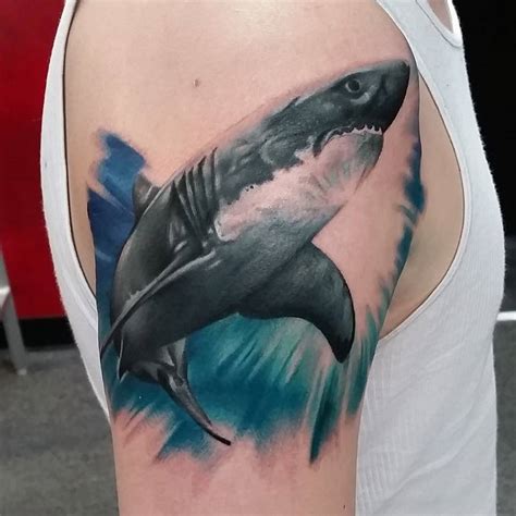 Scary tiger shark tattoo on man right shoulder by tom renshaw. It’s shark week here at tattoodo and we’re going to be checking out some totally sick shark tattoos. More often than not, people who choose shark tattoos want to place them with other undersea life or nautical theme, but tribal shark tattoos which are highly stylised are very effective on their own. There are over 400 species of sharks in the world, so it’s pretty difficult to not come up with a completely unique idea.