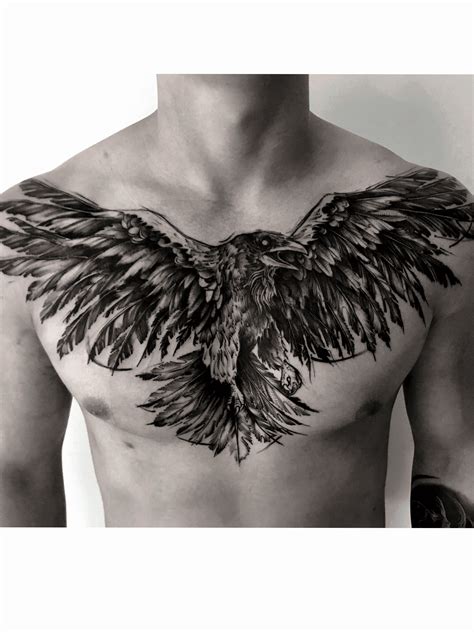 Raven tattoos for men this tattoo entails a raven that has its wings spread out and claws ready to grab on an opponent. Graphical raven tattoo on guys chest, with red flower above. On the chest, the ravens can either go in pair on each pectoralis muscle, or it can span its wings across the entire chest.