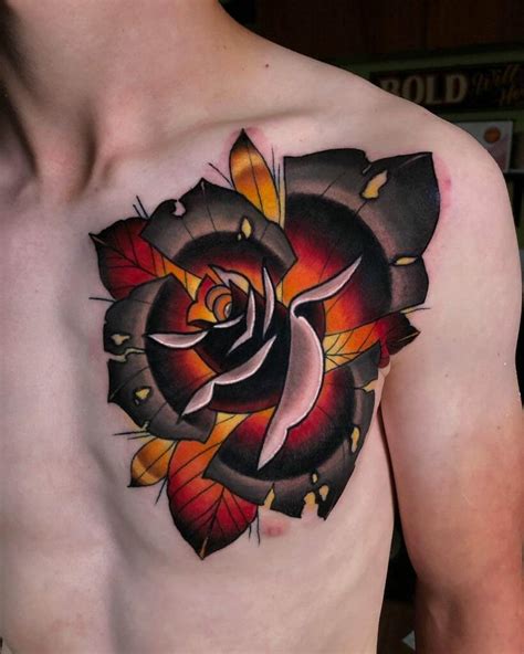New school rose color tattoo. When combined with other symbols, it’s a portrayal of emotions and significance that is hard to ignore. Rose chest tattoo if you’re brave enough to show off your skin and love roses, a rose chest tattoo is a perfect spot. Chest tattoo by yann black. “looking forward to finishing this chest piece when we eventually.