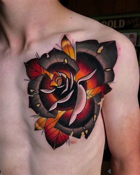 Rose tattoo on the chest a lot of women used to place a rose tattoo at the center of their chests. The traditional design involves three sharp black lines to form a triangular shape filled with thick, dark red blossoms inside. Cultivated in the far east and adopted by europeans, the rose was an emblem to be worn on armor.