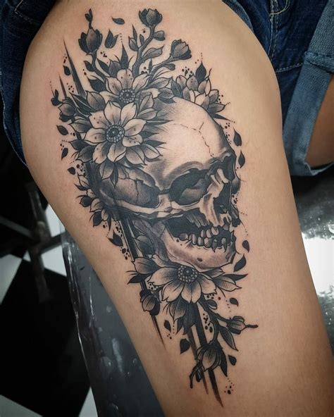 Purple and black flower skull tattoo on body. One of the more popular picture designs for women is the skull and flower tattoo. Fits your phone with openings to match. Black and grey shaded flower skull tattoo on. Cat skull and flowers tattoo sleeve.
